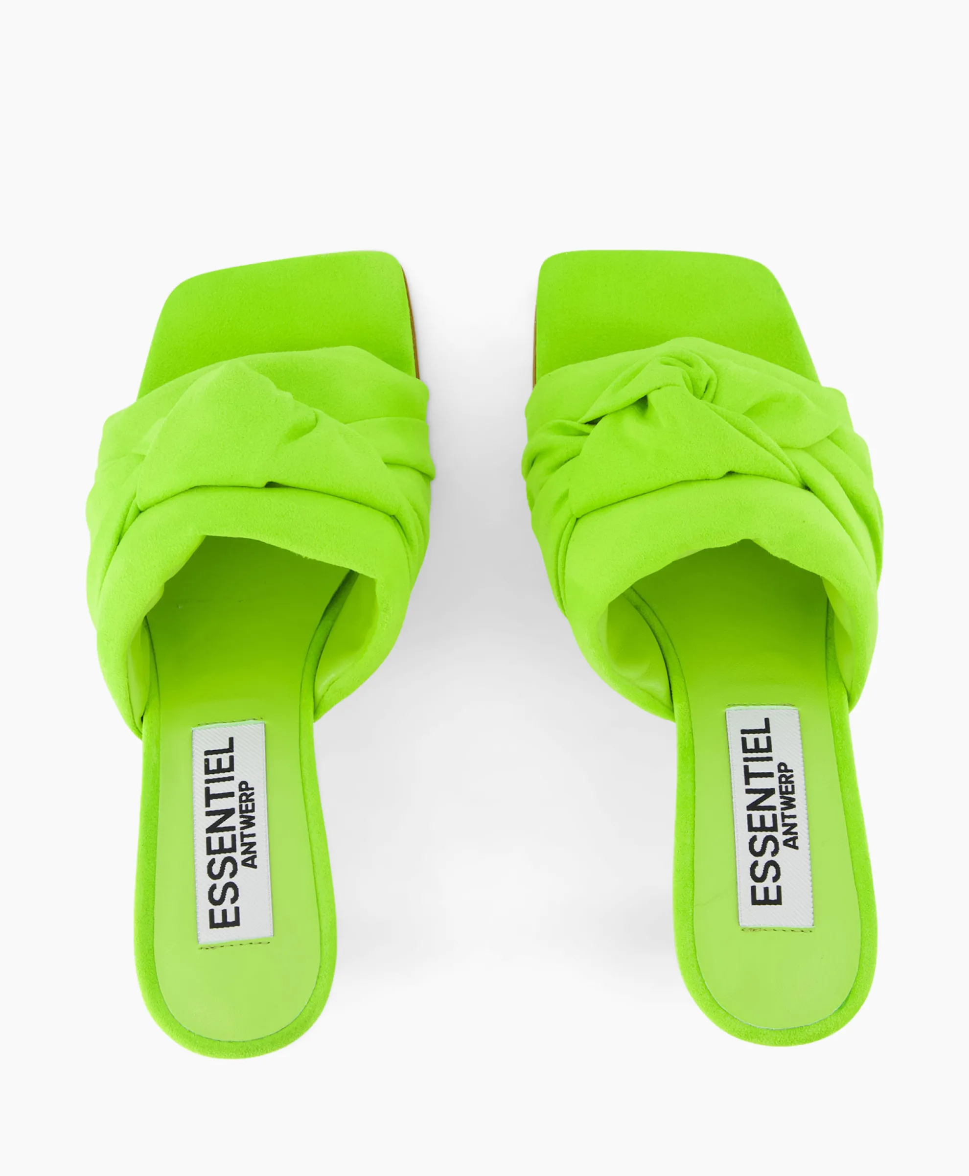 Muiltjes Met Hoge Hak Vervaardigd Van Boterzacht Faux Suèdeleer In Een Model Met Vierkante Neus, Versierd Met Een Knoop. Het Puffy Silhouet Ziet Er Even Stijlvol Uit Bij Een Jeans Als Een Midi-Jurk. Hak: 8 Cm.