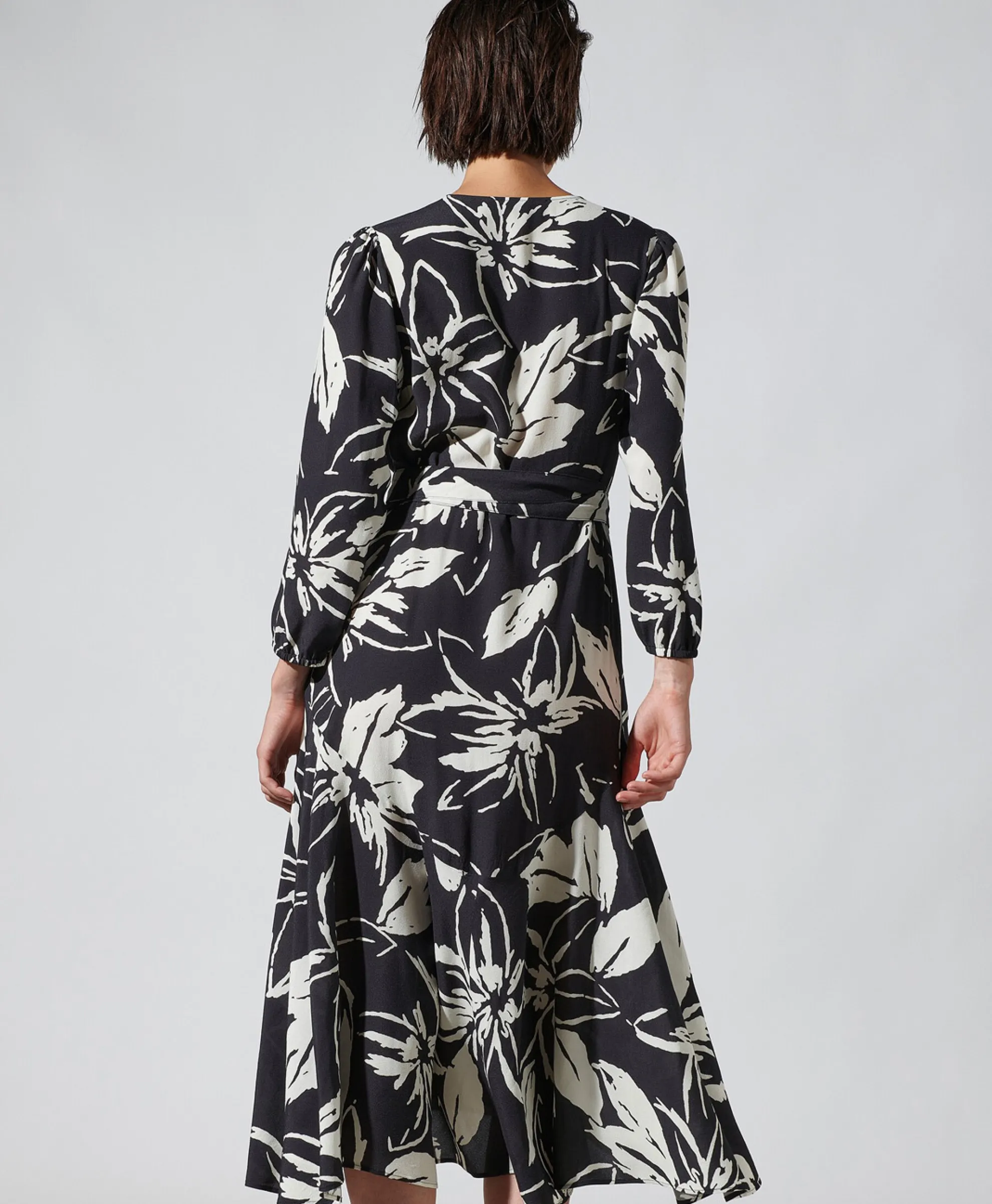 Midi-Wikkeljurk In Een Aansluitende Pasvorm, Afgewerkt Met Diepe V-Hals En Subtiele, Golvende Volants Aan De Zoom. Het Model Is 178 Cm Lang En Draagt Maat 36. Materiaal: 100% Viscose